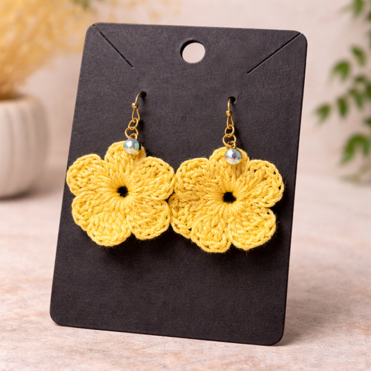 Yellow Crochet Flower Earrings with Pearl Center | Handmade Floral Earrings | Lightweight Statement Jewelry
